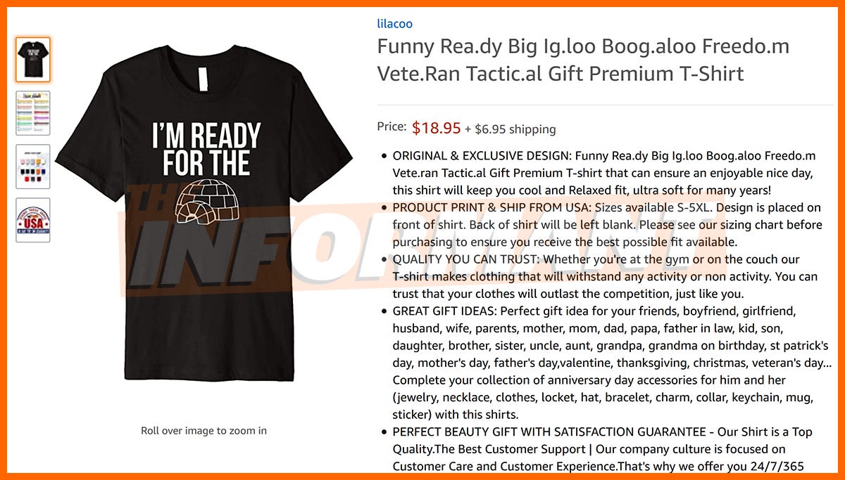 — IT BEGAN WITH A TIP… A reader of The Informant wrote in this week to point out that Amazon, the world’s largest online retailer, has been selling merchandise promoting the so-called “boogaloo” movement. Sure enough, a quick search of the site showed an array of products, including T-shirts, patches, and ball caps that are being sold in connection to the extremist movement.