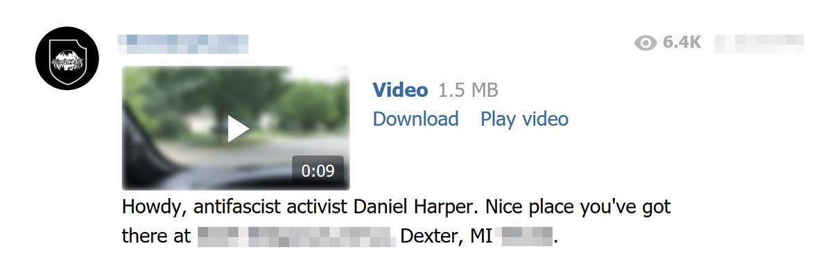 Again, the text of the Telegram posting incorrectly identified the house as belonging to “antifascist activist Daniel Harper.” And again, it repeated the phrase: “Nice place you've got there." It also included the address of the house.